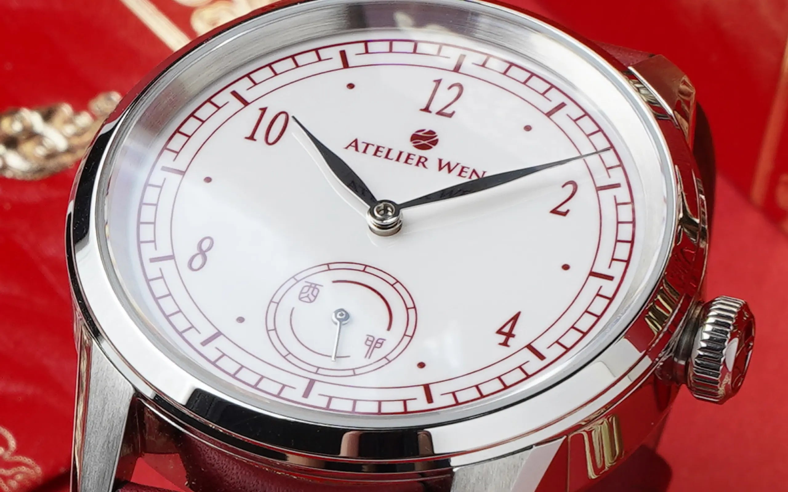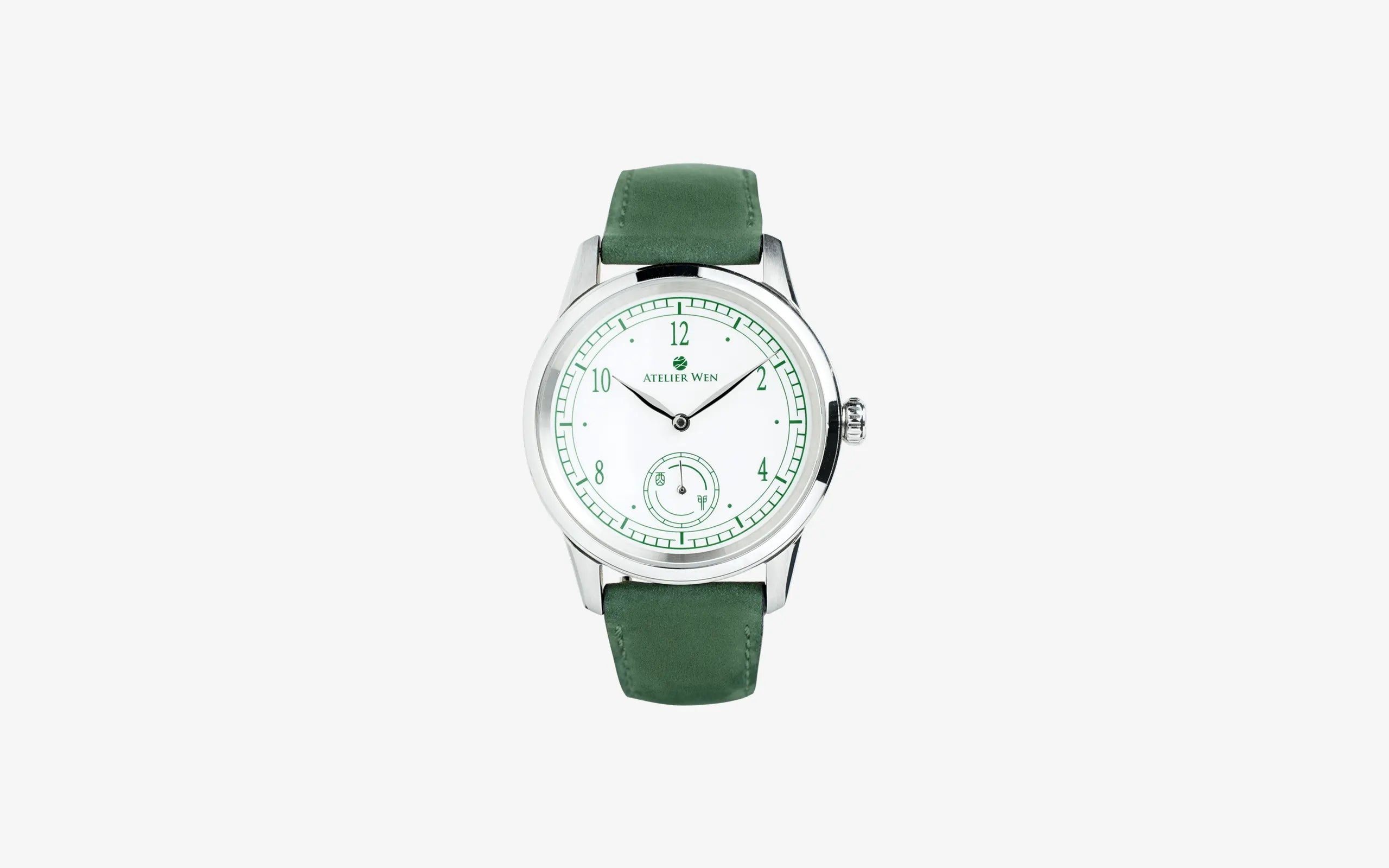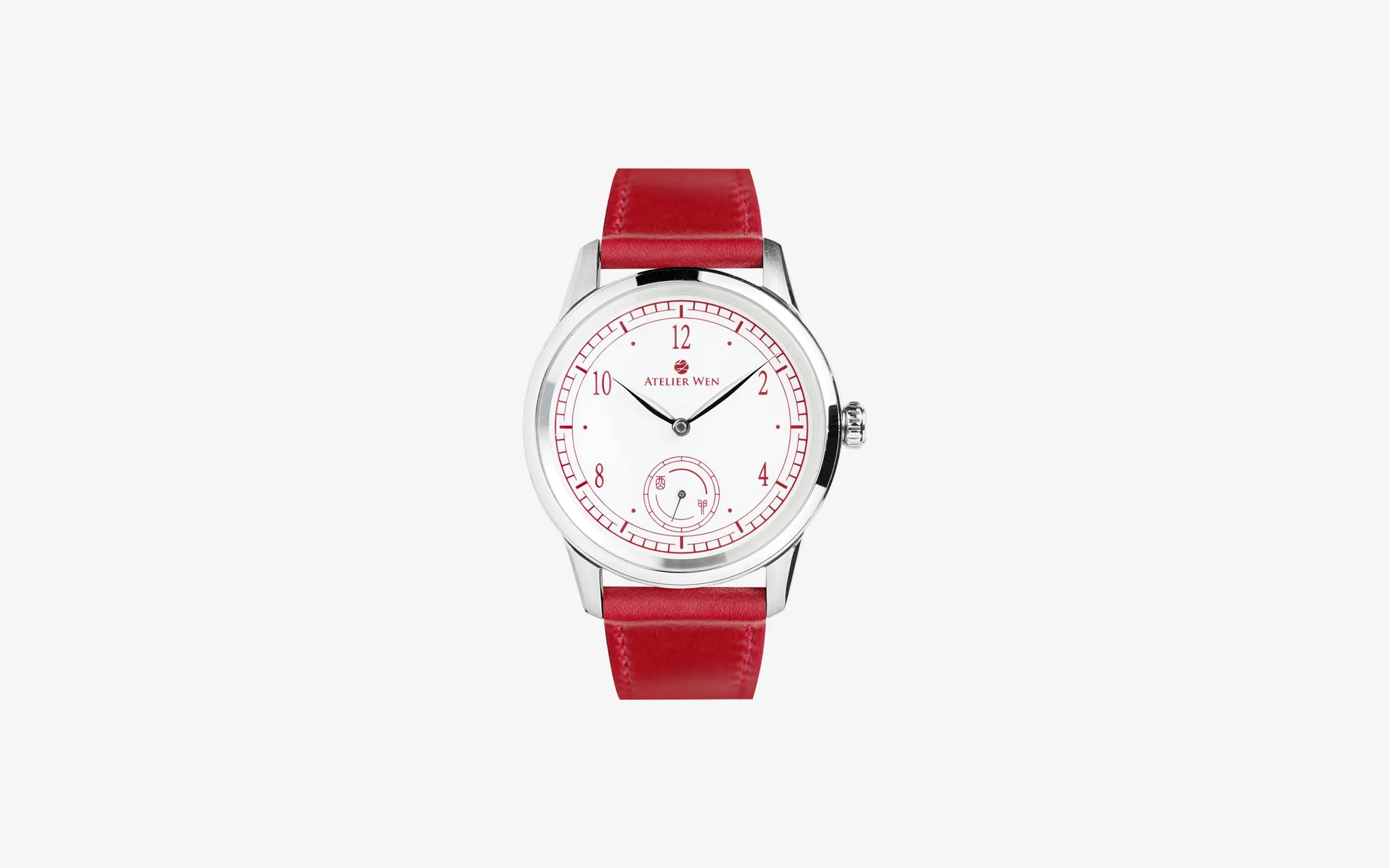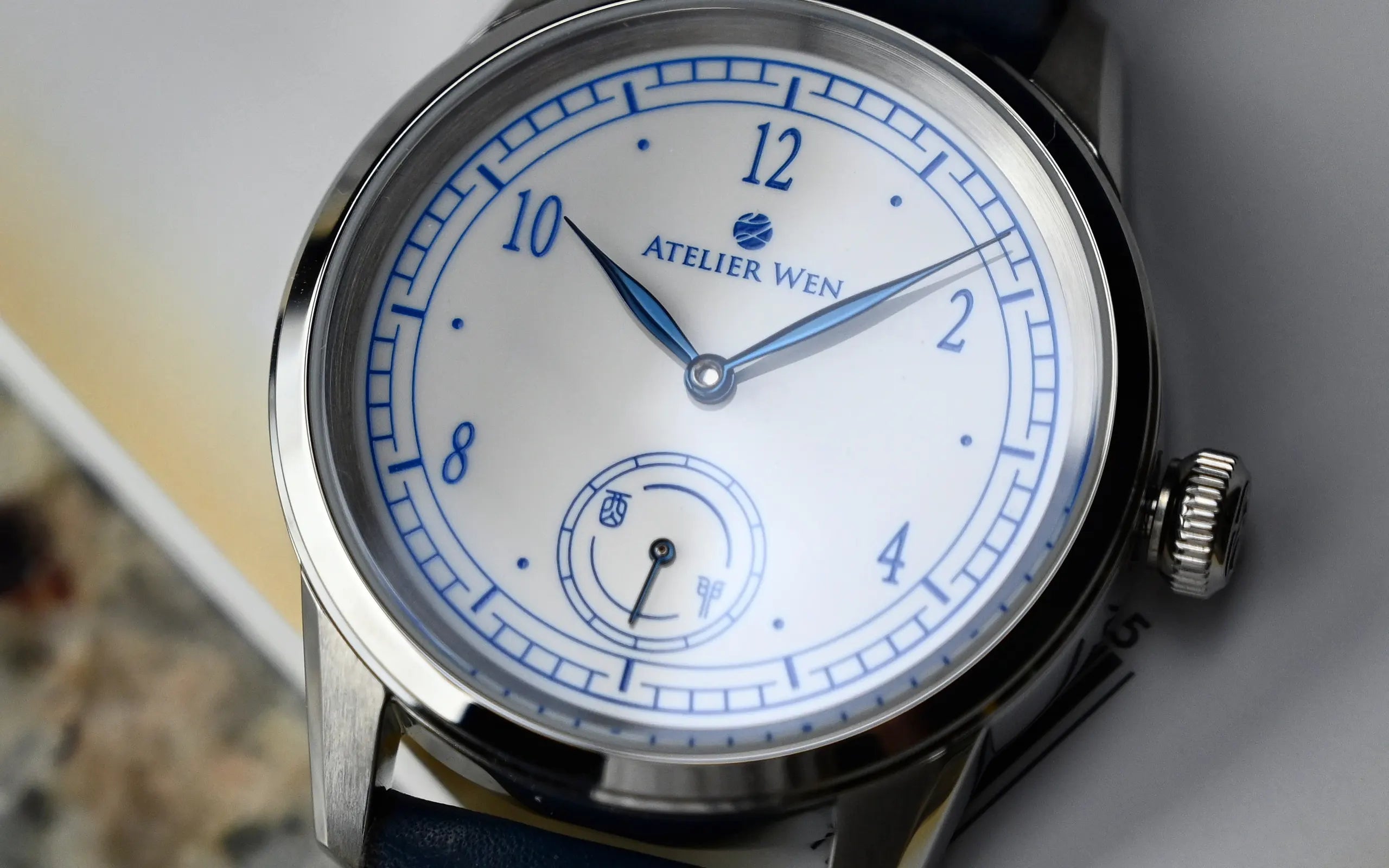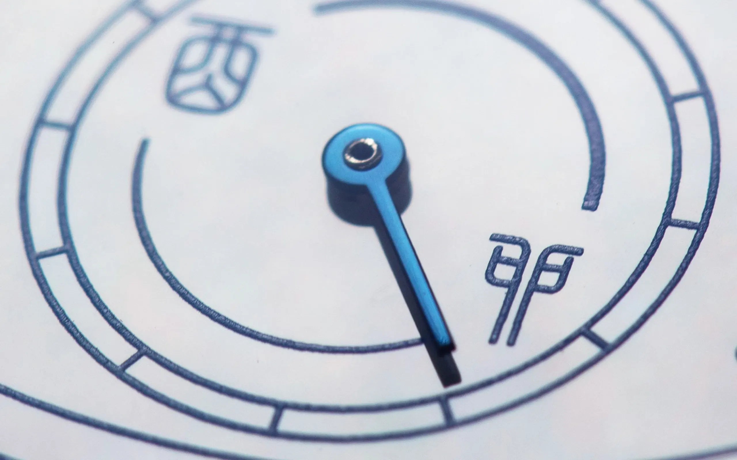 The glossy white porcelain of Hào’s dial pays tribute to famous 青花瓷 (Qing Hua porcelains) of old, so-prized for their milky translucence and elaborate decorative veneers of cobalt oxide that are fired at extremely high temperatures. Here, the semblance of these intricate patterns are reimagined through a raised print of numerals and a 回纹 (huí wén) pattern that is functionally incorporated to serve as the watch’s minute track. The overall dial composition, as mentioned, draws from chronometre watches of the 40s and 50s, and this is no coincidence. In seeking to establish an initial aesthetic, our team chose to revisit the very beginnings of watchmaking in China where the very Chinese timepieces ever made — back in Tianjin in 1955 — carried a strong influence from such chronometre watches.