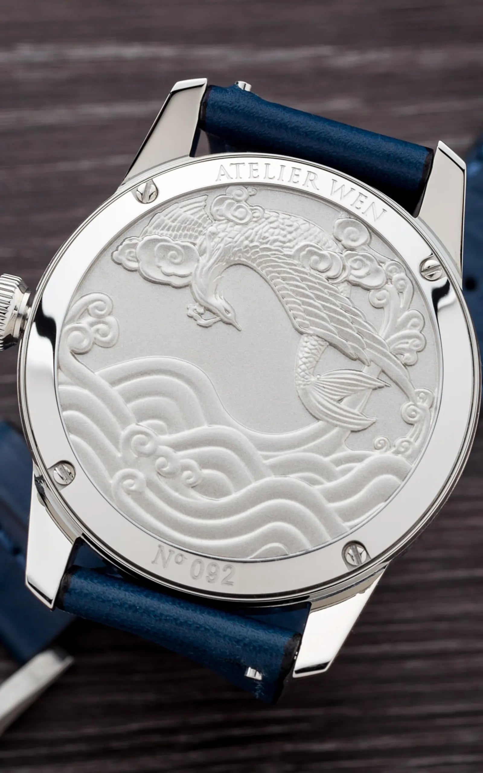 The case-back found on Hào is one of the most striking aspects of this collection. It represents a deeply-embossed figure of an animal of Chinese legend, the kun peng (鲲鵬). Said to be a colossal bird with the ability to turn into an aquatic being , it is used as an allegory for the concept of yīn yáng. Rather than being separate entities, kun and peng are simply two sides of the same element. And in much the same way, our goal with Atelier Wen is to break down the shallow dichotomies that draw lines between East and West, and in doing so, combine the experiences of both to form a greater, more meaningful whole.