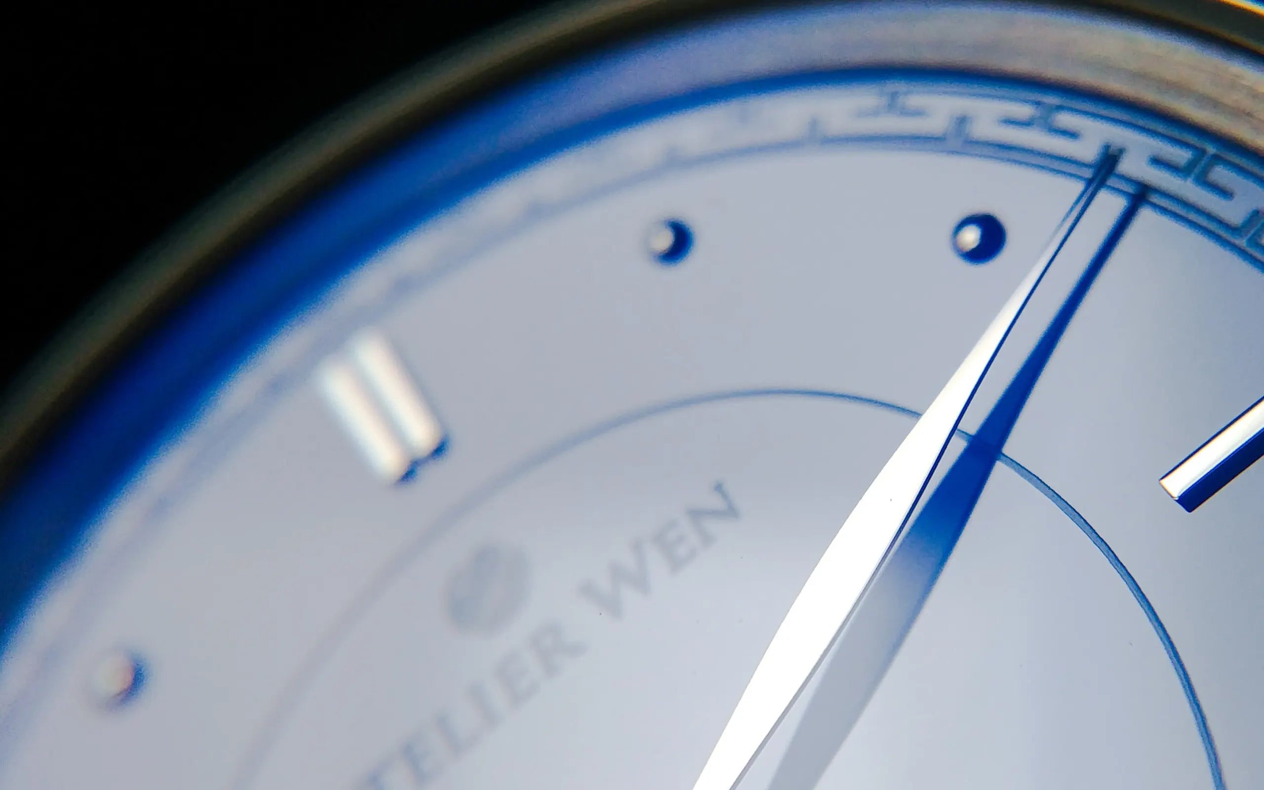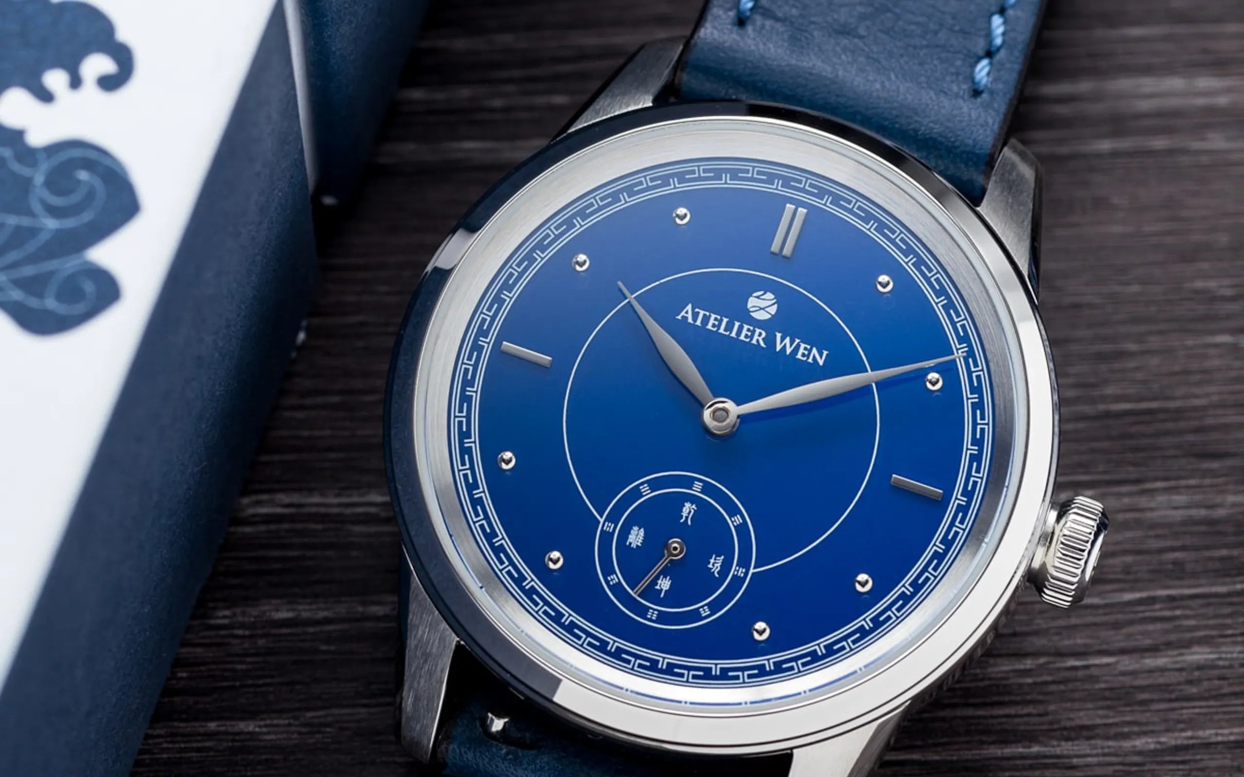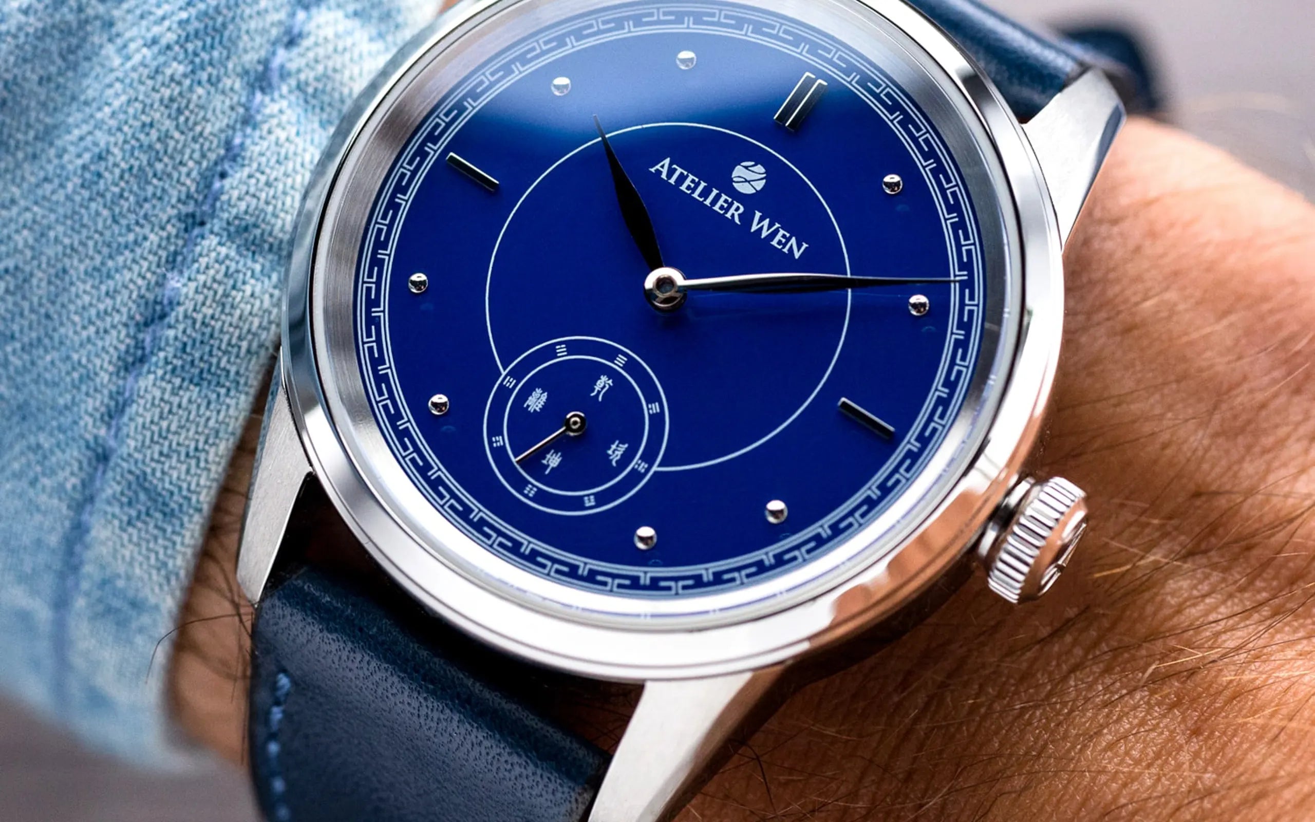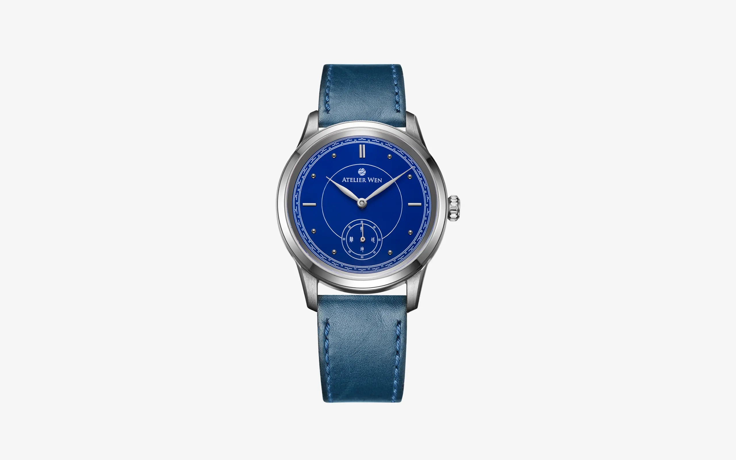 With its mesmerising blue porcelain dial and applied rhodium-plated markers, Jì gives centre-stage to Chinese tradition and the artistic elements found within it. Often regarded as the most beautiful of blues, the colour Jì was said to resemble the sky in the aftermath of a storm, and only the finest porcelains were given the honour of undergoing a primary glaze in its deep hue, imparted by the use of cobalt oxide. The overall dial composition, as mentioned, draws from chronometre watches of the 40s and 50s, and this is no coincidence. In seeking to establish an initial aesthetic, our team chose to revisit the very beginnings of watchmaking in China where the very Chinese timepieces ever made, back in Tianjin in 1955, carried a strong influence from such chronometre watches. In-line with these historical pieces, Jì’s circular and baton markers accent an outer "railway" or "chemin de fer" bordering the extremities of the dial. This feature was reimagined through the lens of our brand incorporating a Chinese pattern called 回纹 (huí wén)..
